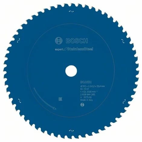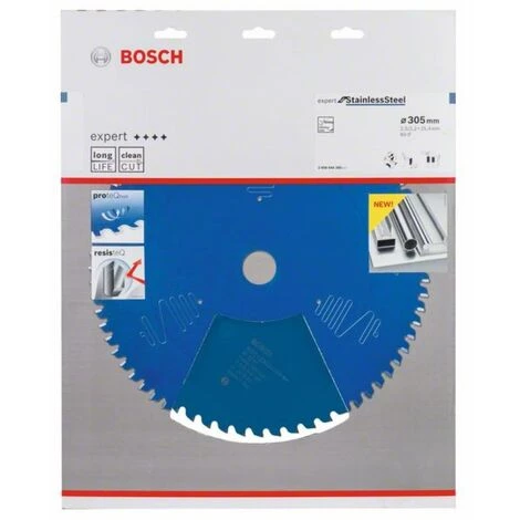 Bosch lame de scie circulaire Expert pour l’acier inoxydable. 305 x 25,4 x 2,5 x 60 lame de scie circulaire Expert pour l’acier inoxydable pour le métal. Les scies onglets (Cutter sec). Diam?tre extérieur: 305 mm. Alésage: 25,4 mm. Largeur de coupe: 2,5 mm. Dents: 60 lame de scie circulaire conçu pour couper l’acier inoxydable / acier inoxydable. ne convient pas pour l’acier fortement allié. Mm Diam?tre extérieur: 305