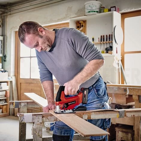La scie sauteuse sans fil TC-JS 18 Li (1×2,5 Ah) Einhell séduit par ses caractéristiques pratiques comme le mouvement pendulaire et la fonction de soufflage des poussières. Elle apporte une finition professionnelle aux projets de bricolage réalisés dans la maison, à l’atelier et au garage.