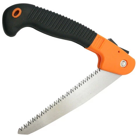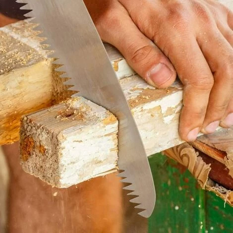 Dents très résistantes et très tranchantes, revêtues à chaque tirage pour réduire la friction et la traînée pour un sciage plus rapide. La lame est solidement montée avec un écrou qui repose sur la poignée, pas trop près du bord, pour réduire les flexions inutiles. Scie d’élagage à lame haute résistance à coupe rapide et longue durée de vie