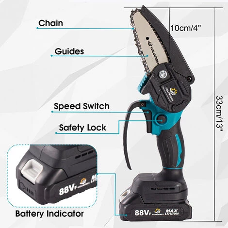 – Commande à une main : petite taille, peut être tenue d’une seule main. La mini tronçonneuse pèse environ 0,7 kg et une longueur totale de seulement 33 cm (13 pouces).