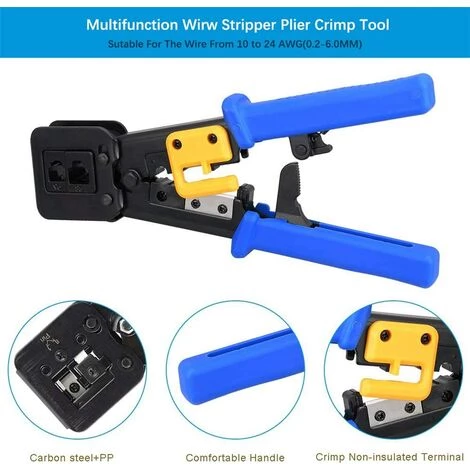 Matériaux de haute qualité – Cet outil de sertissage est fabriqué en acier à outils professionnel ultra-résistant. Noir oxydé pour prévenir la rouille et la corrosion. Il peut être utilisé pendant longtemps. Le manche en PVC texturé peut être facilement décollé et coupé. Outil de sertissage de cable Ethernet intégré à haute efficacité, 6 broches pour chambre de sertissage RJ-12 / RJ-11; 8 broches pour chambre de sertissage RJ-45.