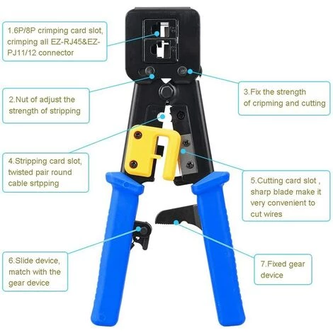 Outil de sertissage RJ45 professionnel – Il s’agit d’une sertisseuse ez via Ethernet polyvalente pour connecteurs Internet traditionnels RJ45 / RJ11 / RJ12, sertisseuses modulaires RJ45 pour applications de transmission de voix et de voix. Opération précise et rapide, coupe, dénudage et sertissage faciles.