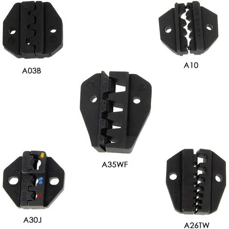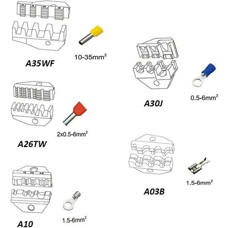 5 inserts amovibles?: a03b n’est pas isolée lin teck de connexion de 1,5-6 mm2, A26TW pour bornes isolées et non isolées embouts terminaux de 2 * 0,5-6 mm2, A10 pour terminaux non isolés de 1,5-6,0 mm2, A30J pour terminaux de 0,5-6,0 mm2 Isolée, A35WF pour non isolés embouts de cable de 10 à 35 mm2.