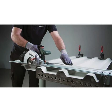 Découpes parfaitement droites de grilles métalliques, de tôles d’acier et de tôles profilées grâce au rail de guidage (accessoire)