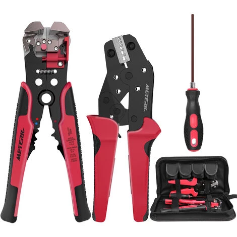 Pince à sertir professionnelle avec mécanisme à cliquet auto-ajustable et dénudeur de fil, pour une utilisation facile.