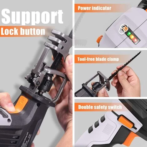 【Indicateur de Batterie】 – La gâchette à vitesse variable avec 0-2500 spm offre un contrôle accru de la lame. Indicateur de puissance affiche la puissance de la batterie, ce qui vous rappelle de la charger à temps pour éviter les retards dans votre travail