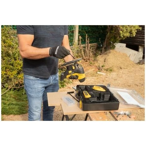 La scie sauteuse est fournie dans un coffre de rangement pratique, ensemble avec une batterie li-ion de 2000mAh, un chargeur, un guide latéral, une clé hexagonale, neuf lames de scie et un raccordement d’aspiration.