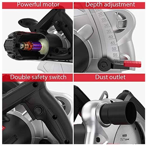 - En appuyant simultanément sur l’interrupteur d’alimentation et la gâchette protégée, vous minimiserez les démarrages accidentels. En attendant, cette scie a une base enveloppante en fer de forte épaisseur et un couvercle supérieur en aluminium épaissi pour une sécurité accrue. Le souffleur de poussière rond permet la connexion à un aspirateur, vous évitant ainsi l’inhalation de poussière.