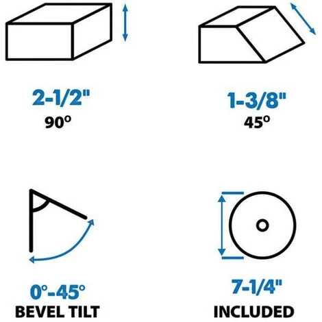 Les leviers à palette vous permettent d’ajuster facilement la plaque de base pour effectuer une coupe en biseau précise jusqu’à 45˚. Le réglage du levier arrière vous permet de régler la semelle dans une position plus élevée, vous offrant une capacité de coupe allant jusqu’à 63 mm.