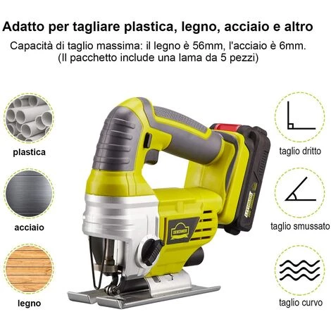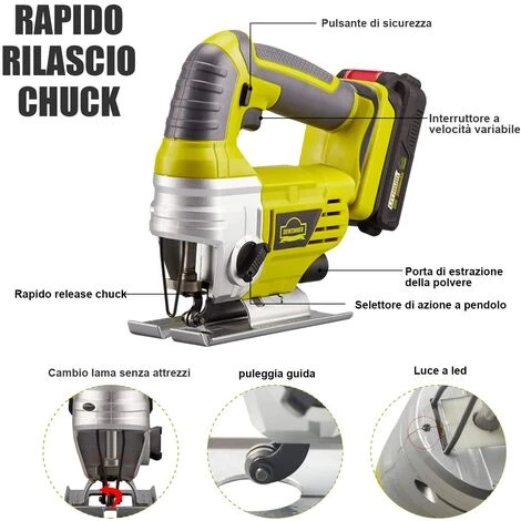 【Changement sans Outil & Vitesse Variable】- La scie sauteuse est équipée de 5 lames: pour le bois, le plastique et l’acier. Le changement de lame sans outil permet d’accélérer les échanges de lame. Réglage de vitesse variable jusqu’à 2400SPM, la gachette et le cadran à vitesse variable peuvent fournir un contrôle précis de la vitesse, vous aider à couper diverses applications et des matériaux plus fins et épais ( profondeur de coupe du bois: 80 mm, métal: 6 mm, 20mm de Course).