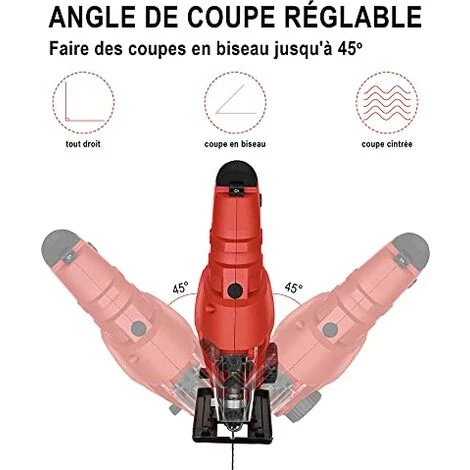 3 MODES DE COUPE ET BOUTON DE VERROUILLAGE: Cette scie sauteuse permet la coupe en ligne, l’inclinaison des coupes biseautées à 45o, la coupe en courbe; La distance de va-et-vient est de 19 mm, peut couper rapidement; Permet de verrouiller la vitesse de travail grace au bouton de verrouillage.
