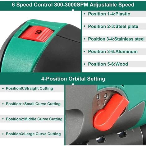 - Avec 6 vitesses réglables réalisent facilement la coupe de différents matériaux(métal, acier, aluminium, bois, etc.).