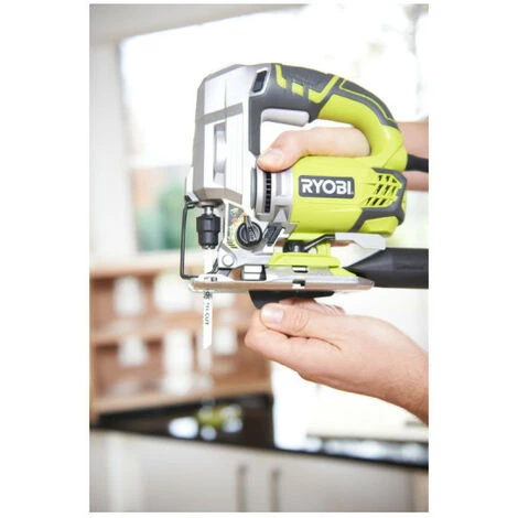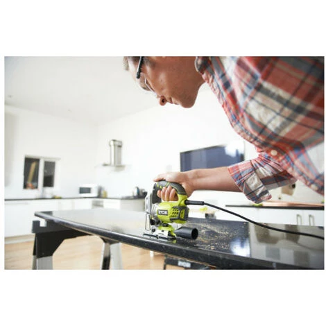 La Scie sauteuse pendulaire électrique RYOBI 680W 105mm bois RJS1050-Kavec semelle orientable à 45° de chaque côté pour des coupes biaises. Son nouveau système de maintien de la lame permet une forte réduction des vibrations et une meilleure utilisation de la machine.