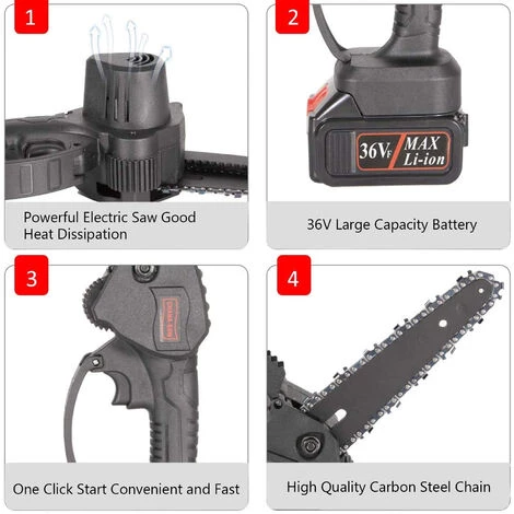 [Bonne qualité] Cette tronçonneuse commence par un bouton et est facile à utiliser. Grande vitesse, force de coupe élevée. La tronçonneuse est équipée d’une chaîne en acier au carbone de haute qualité, dissipant rapidement la chaleur.