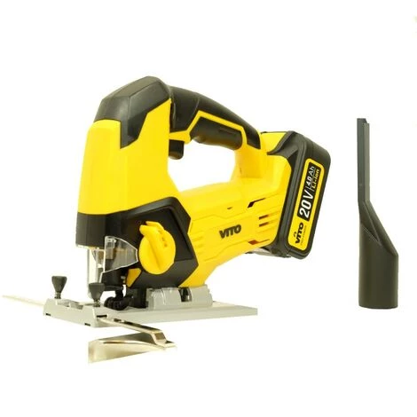 Scie sauteuse sans fil 20V VITOPOWER avec une vitesse de 2400 tours/minute. Rotation de l’appareil jusqu’à 45º, protection de la lame en acrylique. Elle dotée d’une fonction pendulaire. Cette lame est idéale pour découper le bois jusqu’à 80 mm et l’acier jusqu’à 10 mm. Inclus : 2 batteries 4.0 Ah + un chargeur rapide.