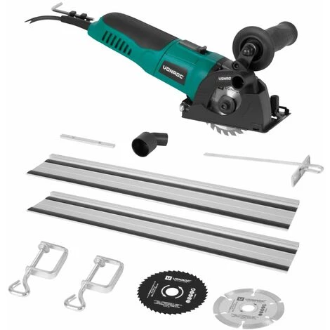 Grâce à cette mini scie circulaire de VONROC, toutes vos découpes de précision deviennent un jeu d’enfant. La machine est livrée avec jeu de deux rails de guidage d’une longueur totale de 100cm qui vous permet de découper aussi droit et précisément que possible. Les trois lames fournies vous permettent de découper tout un éventail de matières comme le bois, l’aluminium, le plastique ou encore la pierre. Cette machine peut de plus servir de scie plongeante pour découper des cavités pour les prises électriques ou pour effectuer la découpe d’un plan de travail pour y installer un évier.