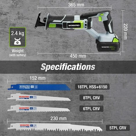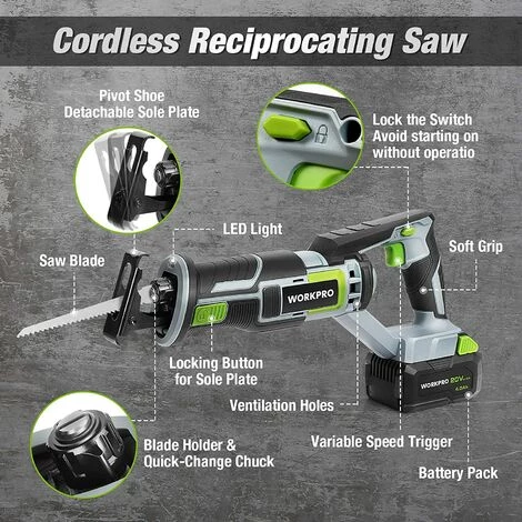 【Vitesse Variable】WORKPRO scie égoïne électrique sans fil atteint une longueur de course de 25 mm et une vitesse à vide de 0-2800 RPM, ce qui peut répondre aux besoins de coupe différentes sur matériaux divers. La gâchette à vitesse variable fournit une vitesse adaptée pour différents travaux de coupe