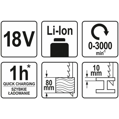 - Requis : 1 x batterie Li-Ion 18 V 2,0 Ah et 1 x chargeur d’1 h (non inclus)